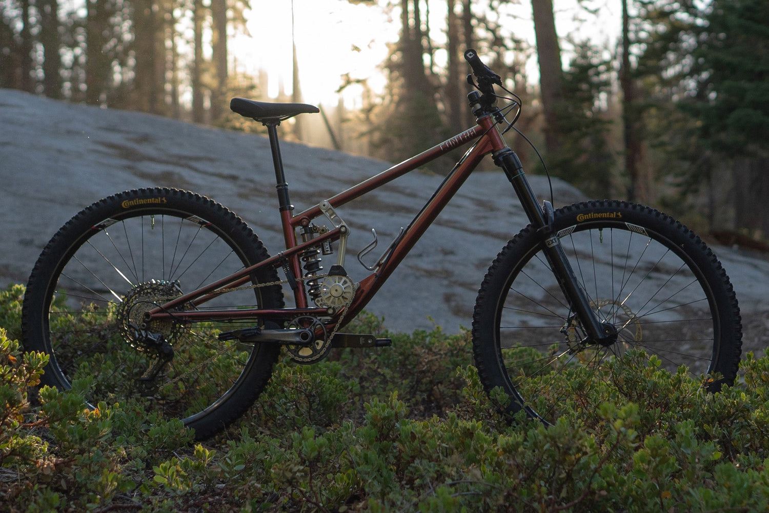 The first prototype frame was a high single-pivot with a shock linkage to control the leverage ratio. It featured a large 22-tooth idler pulley to reduce friction, 100% anti-rise, and 100% anti-squat at sag in every gear. It rode well, but suspension performance was held back by the high unsprung weight of the swingarm and linkage and too high of anti-rise. It was also very complicated to construct.